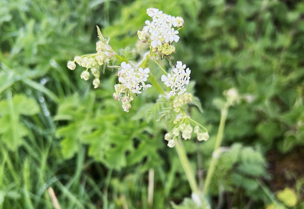In the countryside around us early and mid-spring is giving way to late Spring, and even the first signs of Summer. With no rain for weeks, and temperatures in mid 20s, it has certainly felt like Summer over the last few days. Walking down the field track, the rape blossom is fading, petals falling to the ground, the intense yellow of only a few days ago being now just a sprinkling of yellow in the green foliage. The crop has been sprayed this week, with herbicide or pesticide. Despite this chemical dose, the first poppies have appeared among the first ox-eye daisies at the edge of the crop. On the other side of the track, by the hawthorn hedge, frothy white cow parsley, or “Keck” in these parts, is blooming, matching both the white hawthorn blossoms on tall shrubs further down the track, and the white fur of Sam, happily trotting along the track. Among the nettles by the crumbling red bricks of the old barn a solitary Hogweed flower is beginning to unfurl.