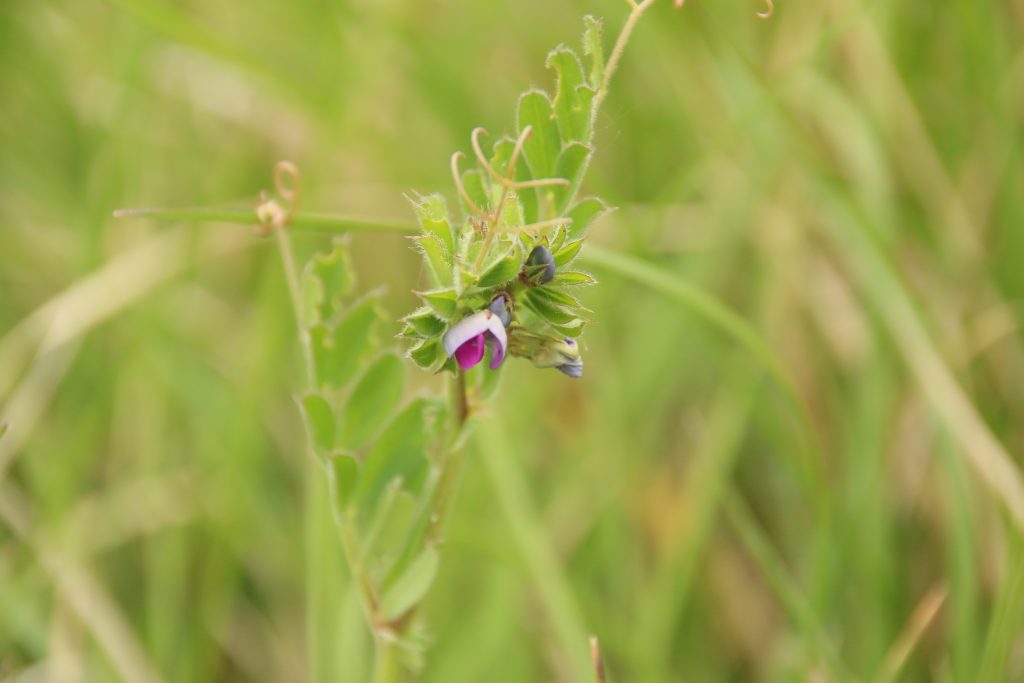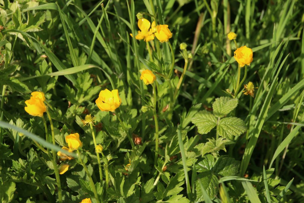 More spring flowers are making an appearance. In a damp area of lush grasses, mainly Cocksfoot, Red Campion flourishes. Even this area is dry on the surface after weeks without rain together with drying winds but will still hold moisture not far beneath the surface. Only a few metres away, away from the damp provided by the shade from the mature hedgerow of Blackthorn and Hawthorn, grass is shorter, and decorated with yellow Hairy Buttercup, taller than meadow buttercups. Purple Common Vetch nestles in the grass, between the buttercups.