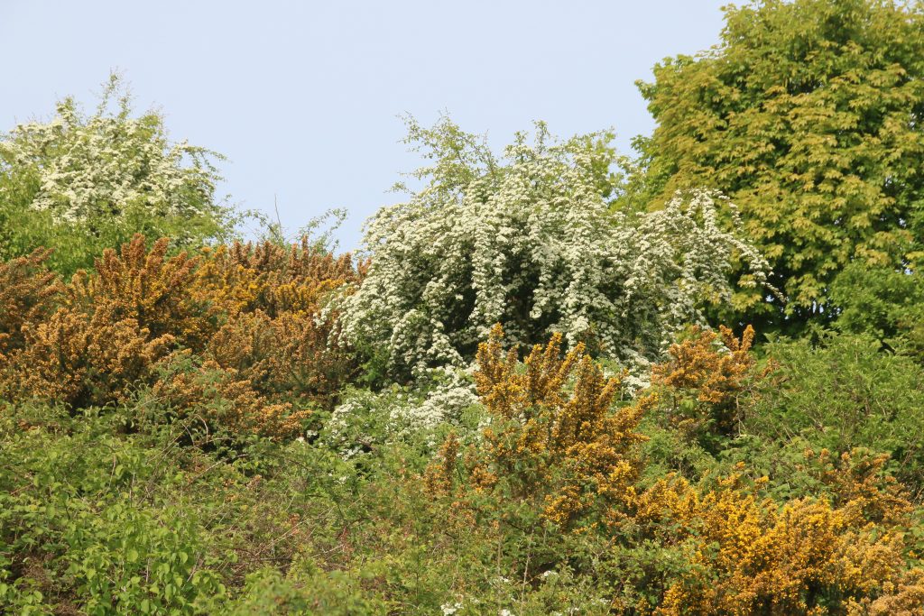 It is Hawthorn that is dominating the natural countryside, the blooms full and dense on tall shrubs and lower hedges, dividing fields, and competing for attention with the yellow Gorse on and around Croft Hill. May is usually the most productive time of year in nature, with the right balance of sunshine, rain and warmth. Sunshine is aplenty this year, but rain and warmth, apart from a few hot days giving brief relief from the north wind, have been limited. But nature is still productive, if not as vigorous as in past years.