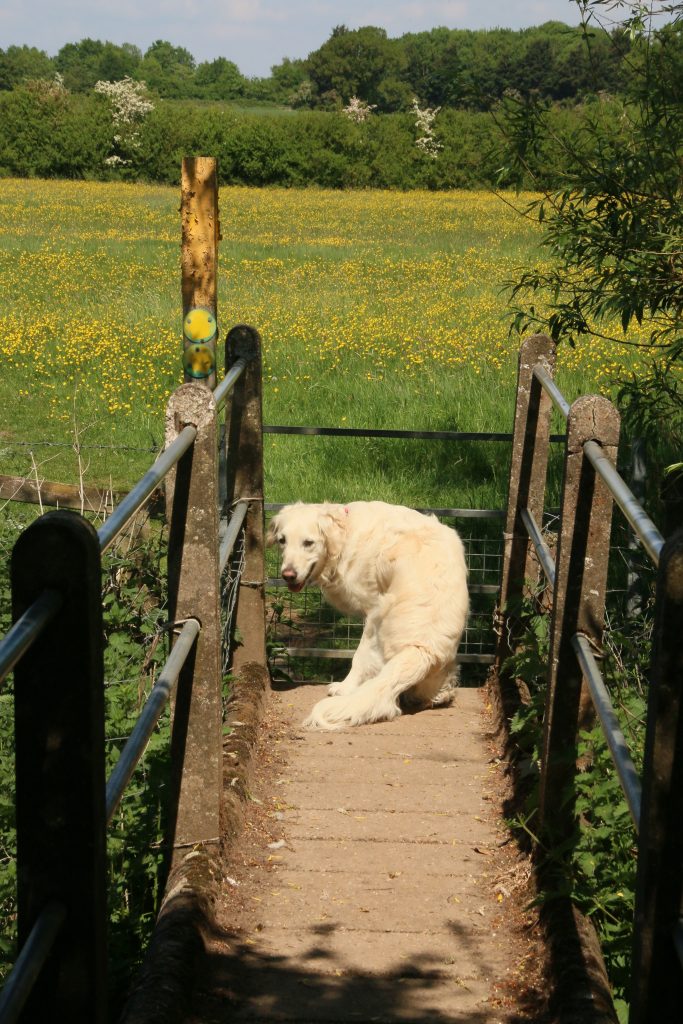 The rape field behind is now in full blossom, the plants now waist high, tangled together and almost impenetrable, which at least keeps the dogs on the field track running alongside the crop. We walk past the rape and cross the footbridge into the “Sheep Field”. A circuit of this large field is a convenient dog walk if we are clock-watching, or maybe in particularly unpleasant weather, as long as there are no ovine occupants. There have been no sheep in the field since Autumn, when the grass stops growing, and perhaps of more significance, before the regular winter flooding of this riverside meadow. Tyre tracks in the long grass suggest that the farmer has been checking the fences, and no-doubt sheep will once again be in residence soon.