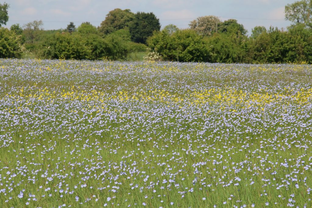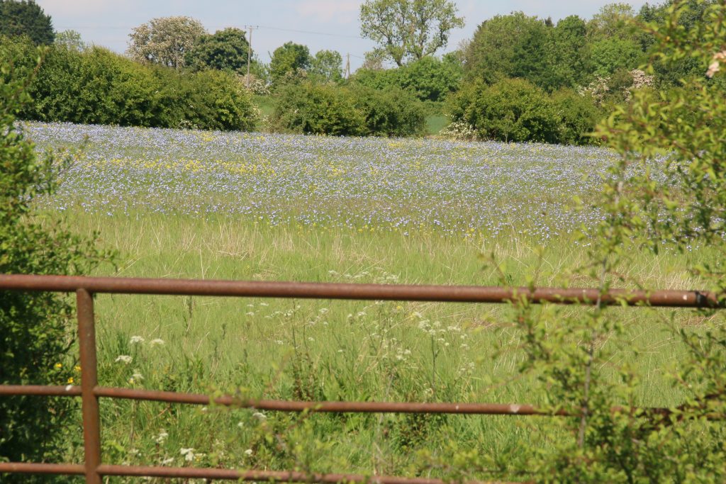 We walk across the bridge over Thurlaston Brook, unsurprisingly low, and into the “Sheep Field”, where the yellow hairy buttercups dominate the greenery of the tall grasses. Still no sheep in the field, which means that the grass will almost certainly be mown for sileage or hay next month. Across the field, on the far side of the stile and “plank bridge” over the drainage ditch, I surprised to see a sea of blue, looking distinctly aquatic. The blue was Flax, “Perennial Flax” I think. Flax has been an occasional crop in local fields over the years, but this was in an area left to grass and wildflowers. The flax may have been in a wildflower mix.