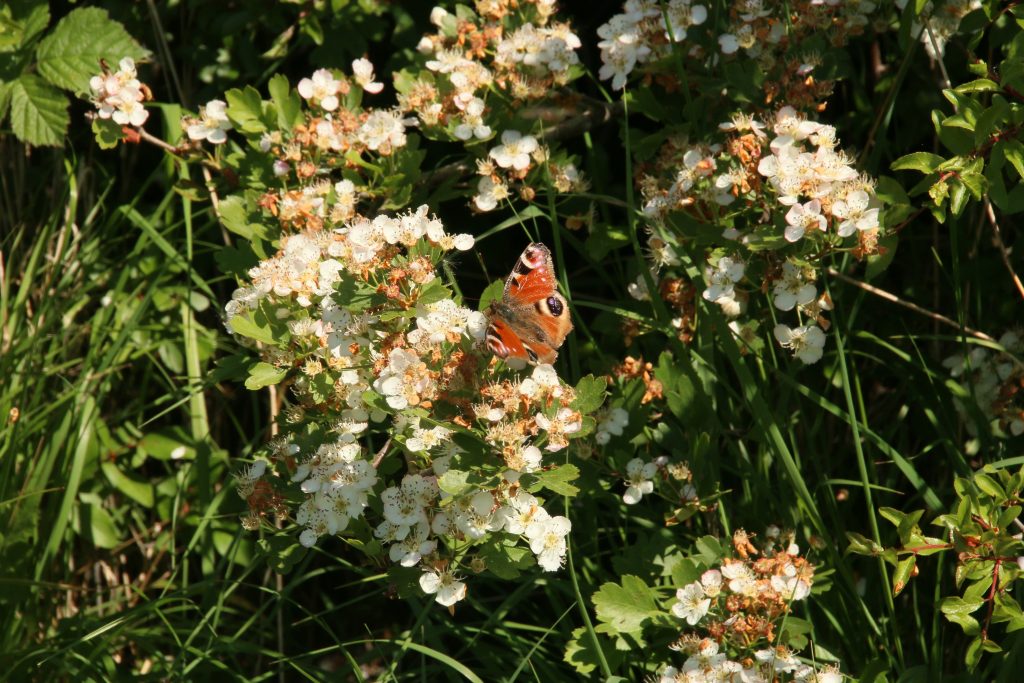 Like the cultivated rape, the earliest of the hawthorn flowers are fading, but still sufficient flowers for a peacock butterfly to feed, pausing briefly with open wings absorbing the warmth of the sunshine, before folding them neatly over its back to look a little less conspicuous.