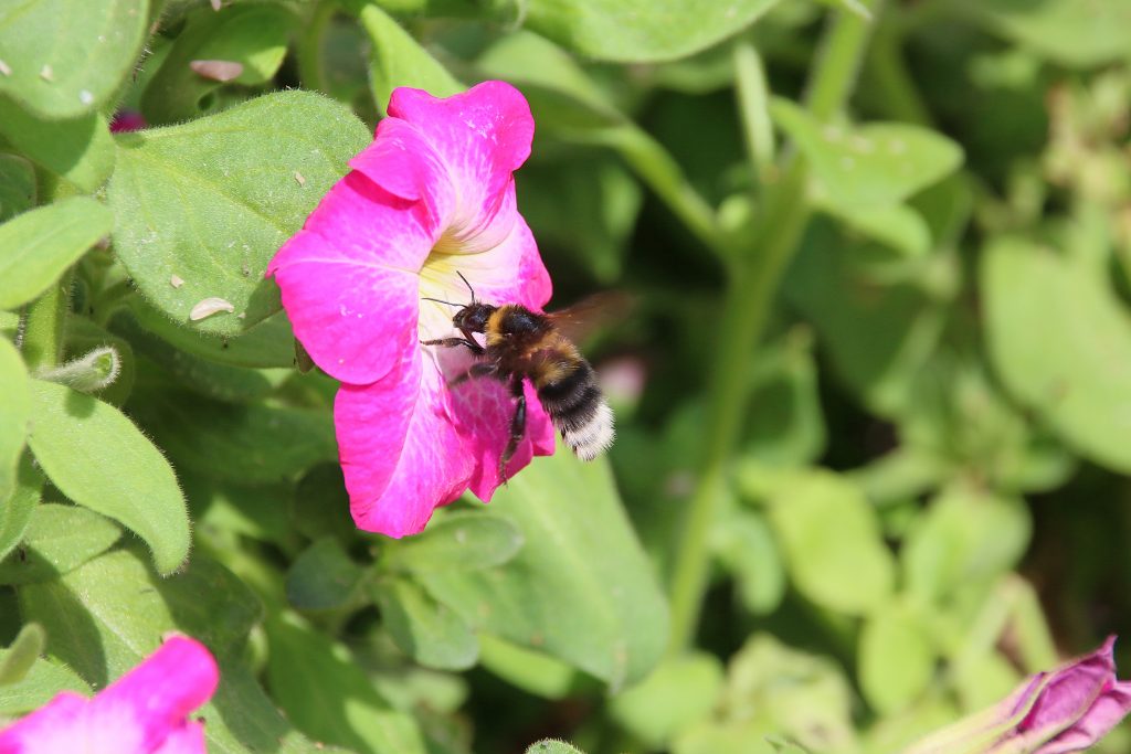 In the garden flowering plants are carefully managed to have blooms around from Spring until Autumn, to the advantage of many insects. Bees prefer pink and purple blooms, and a buff tailed bumblebee takes advantage of the petunias on our patio, moving from flower to flower, burrowing deep into each bloom to collect nectar.