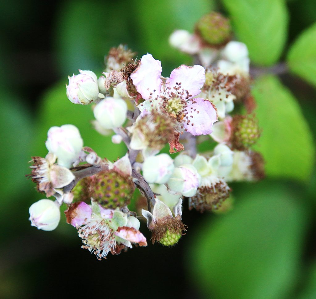 A more familiar route takes us towards the village of Thurlaston, going through a “kissing gate” through what feels like a wooded track, but the trees only line the path, with fields beyond. Despite some warm sunny days the path was damp and muddy in places. Brambles grow in the hedgerows, and this year there are already some ripe blackberries among the pink flowers and green unripe fruit. The brambles have not yet had enough sunshine to sweeten the fruit, which may look succulent, but are tart, almost bitter, to taste, and a little dry. There will more and sweeter berries in a month or so.