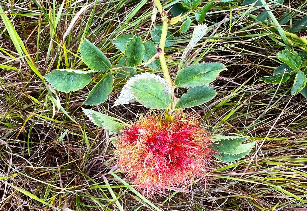 Blackberries continue to ripen on the brambles in the hedgerows. Like the cereal crops the fruit is ready for “harvest” by passing walkers earlier than usual. The fully ripe blackberries are sweet, but small, containing many small seeds that get stuck between the teeth. I spot a “Robins Pincushion” growing on a wild rose in the hedge alongside the field of oats. This is a “gall”, caused by the larvae of a tiny gall wasp that feeds on the gall, the tiny wasps emerging in Spring. The larvae do not damage the host wild rose, which will once again produce an abundance of dog-roses next Summer.
