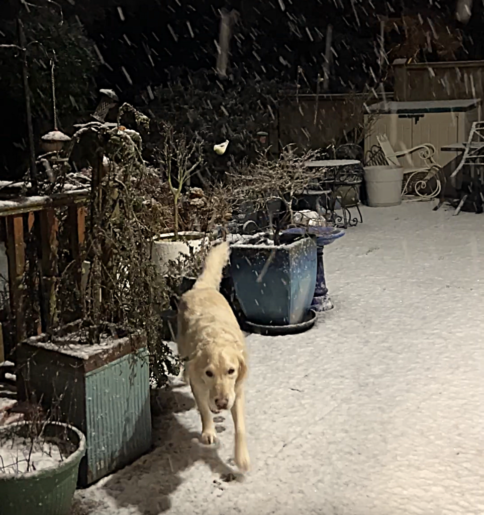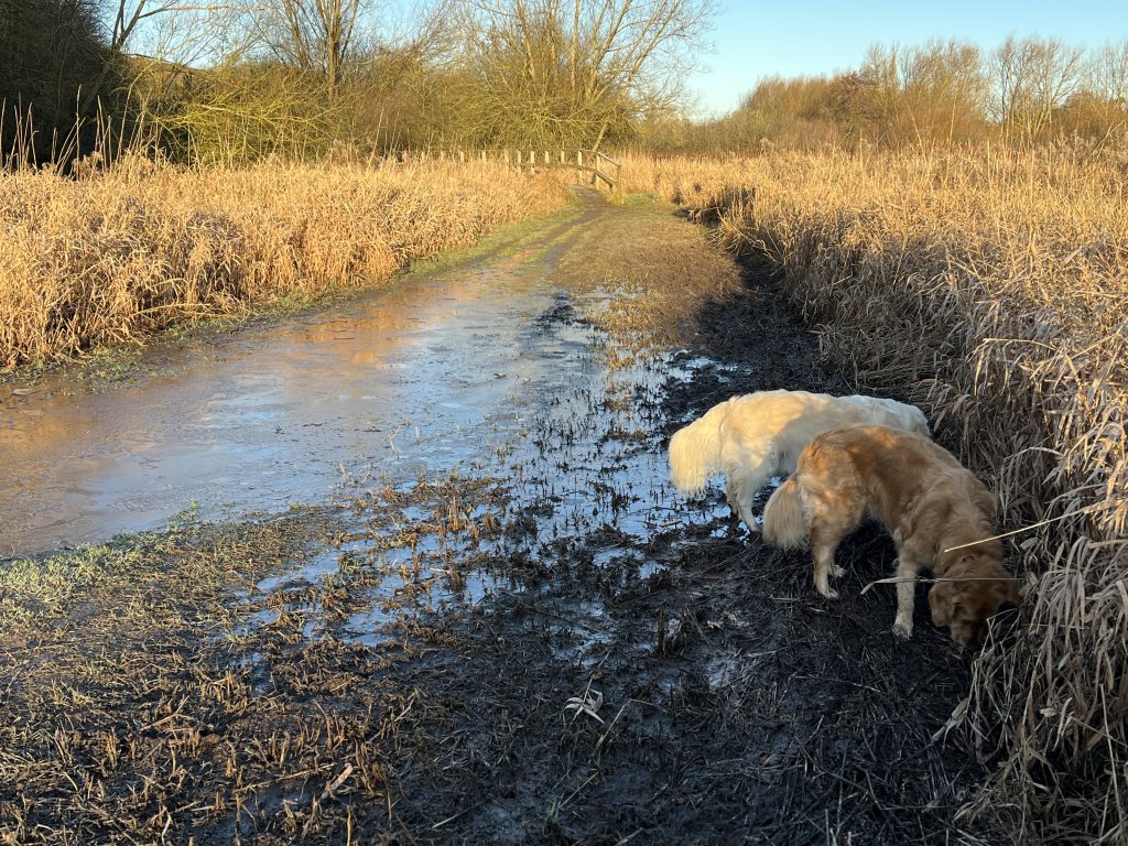 Back at home I had a problem. I have two muddy dogs, but the outdoor hose is still frozen. The dogs benefit – my only option is to wash them with warm water from a watering can, rubbing the mud away before retiring indoors for, in my case, coffee and one of the remaining Christmas mince pies.