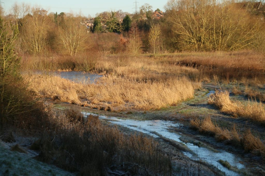 The river is high, almost but not quite breaching the banks, although if the thaw continues there is the chance of some flooding across this low-lying pasture. The field has already flooded two or three times this winter, and with the ground quite compact thanks to sheep grazing here until late November, it can take several dry days for the water to drain away.