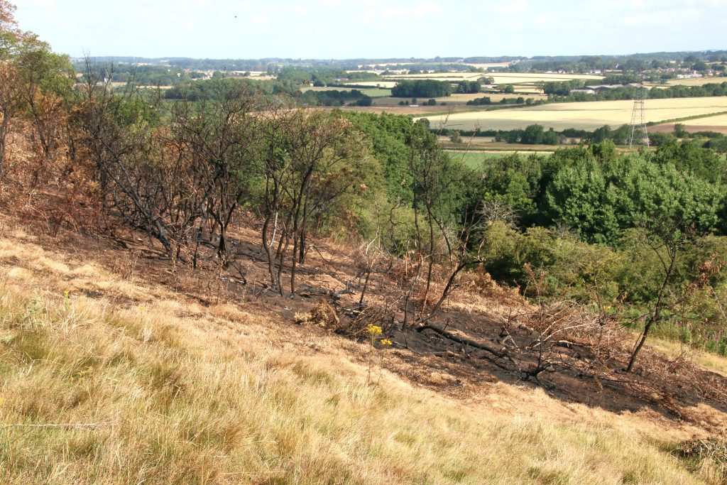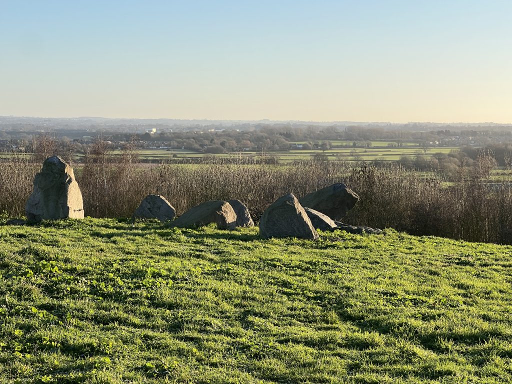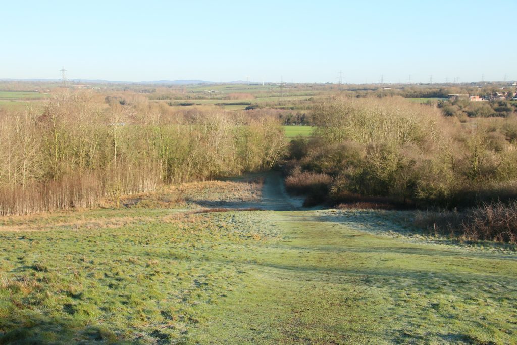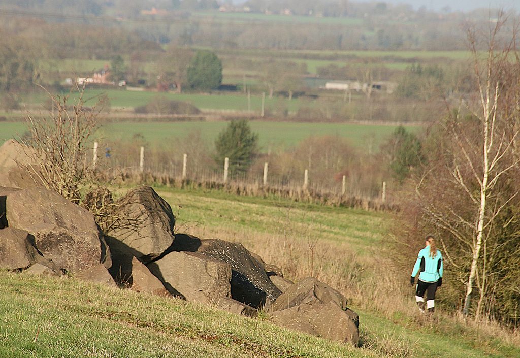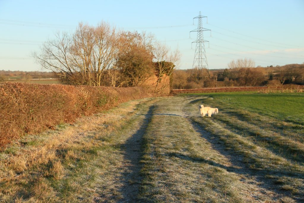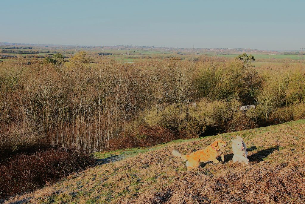 As we approach the top, I see a young couple sitting close together on the rocks around the Trig Point, looking out across the view of South Leicestershire. I put both dogs on lead – the couple will not want their shared time together enjoying the wintery scene interrupted by two bouncy and over friendly Golden Retrievers. The girl comments than my dogs are cute. She wouldn’t be saying that if she was being mugged by Sam trying to give her a hug. We continue down the Hill and back home. I have logs to stack.