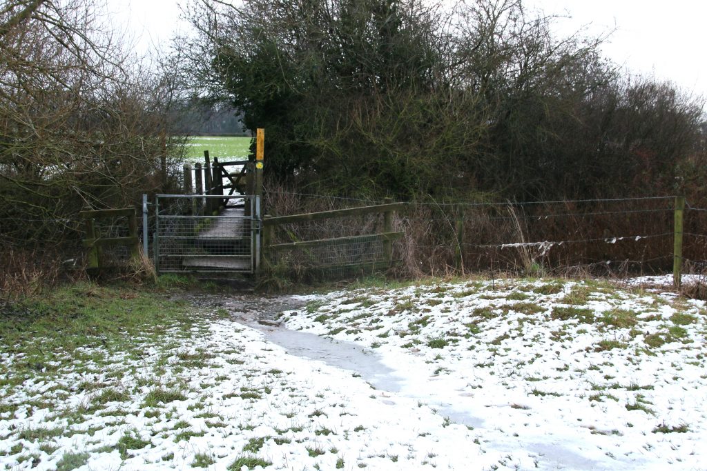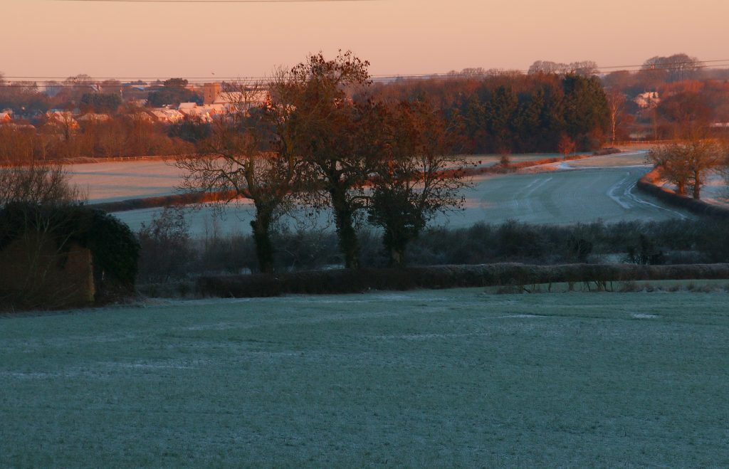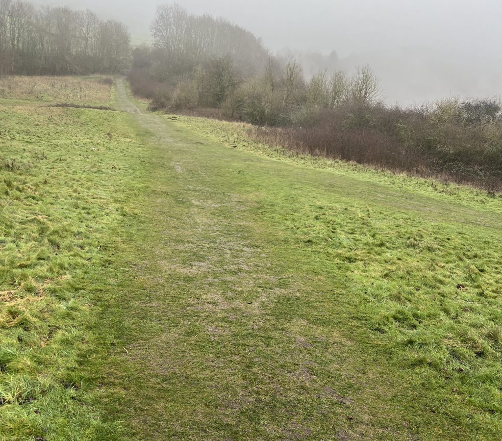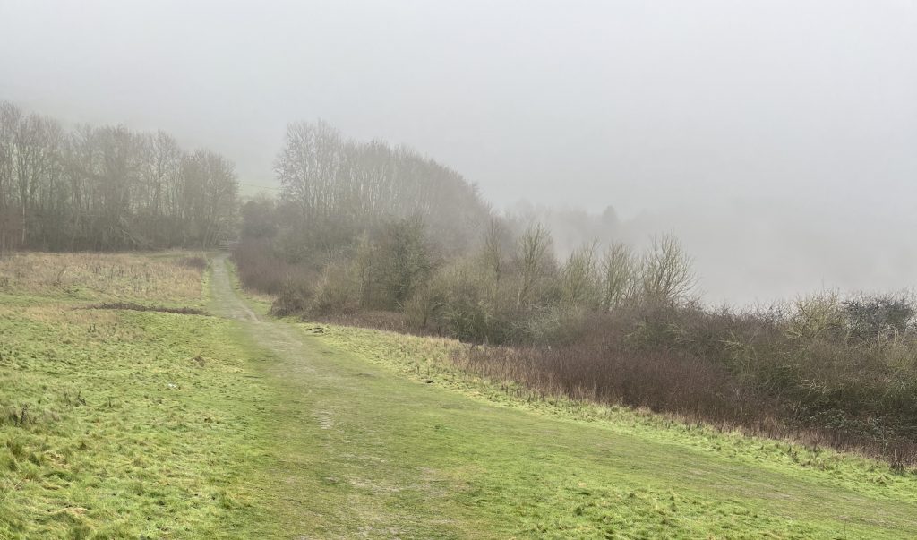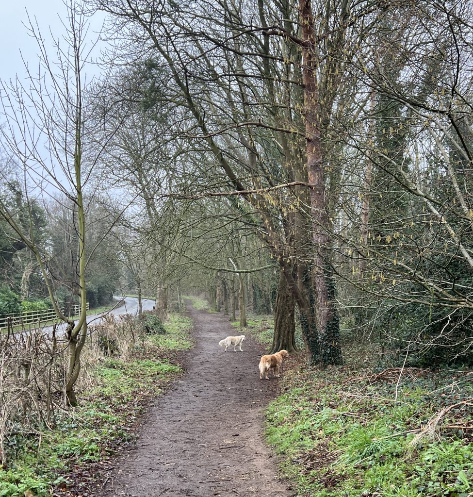 We have lost the bitter easterly wind and so, despite thick mist under a slate-grey it actually feels relatively mild despite the temperature still hovering above zero. I start this morning’s walk by climbing up Croft Hill, hoping that yesterday ice has thawed sufficiently to allow my boots to grip, unlike yesterday. The ice has not thawed, but I manage to climb to the top before walking back down safely through the grass on the far side. We continue down towards the village, meeting a regular dog walker with a pair of Foxhounds. Since they are both on leads, I put my two on a lead, despite knowing that the Foxhounds are friendly – they on lead because off lead they would probably pick up a scent and be gone, following the scent deaf to the cried of their owner calling them back.