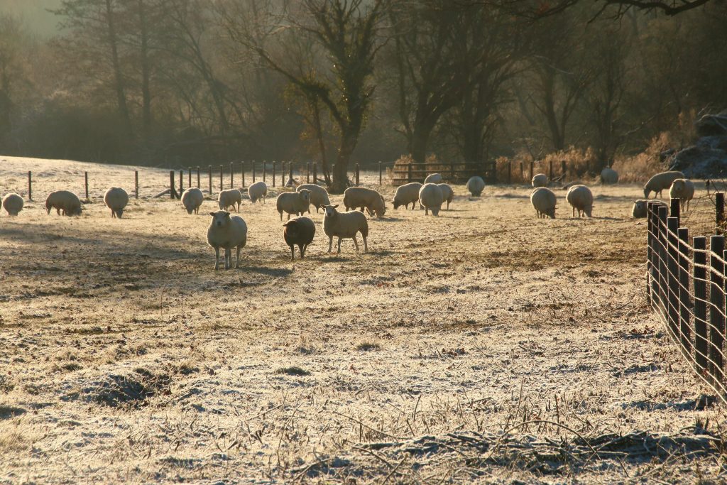 A month or so ago, from the top of Croft Hill, I noticed that there was a lot of sheep across the landscape, more than usual. In winter cattle are often brought indoors, but sheep are left outside, even, around here, when lambing, since their lighter weight is less likely to damage damp pasture. But then most fields were emptied of sheep. Maybe there was a seasonal increase of price and demand for lamb. Sheep are starting to appear again in some fields, possibly pregnant ewes prior to lambing – too early to tell.