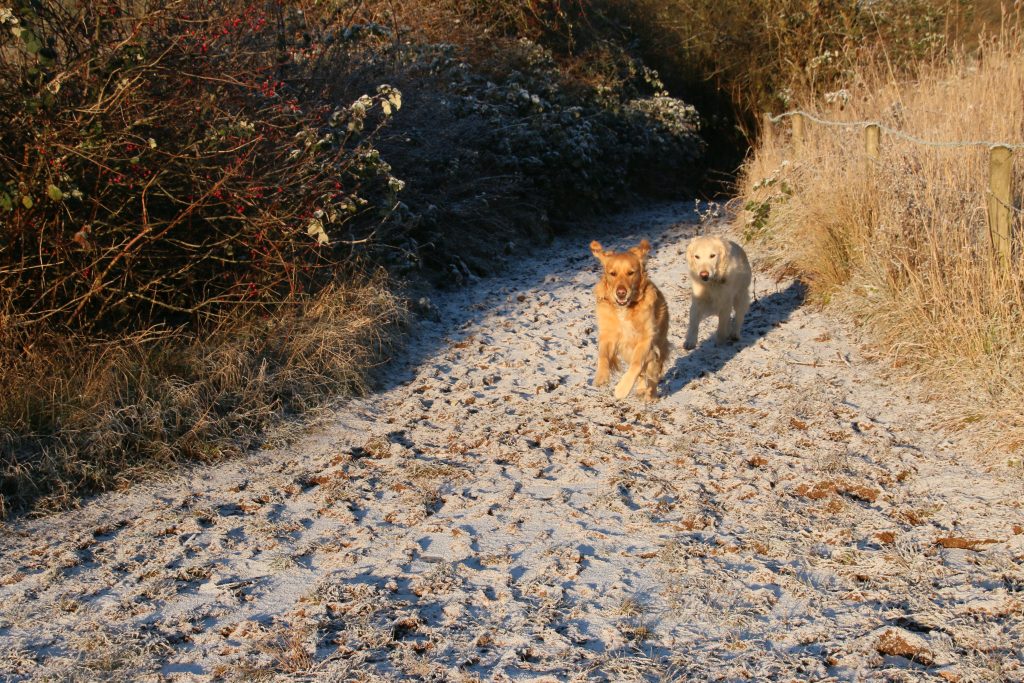 I see two people approaching, coming at us along the narrow path, out of the low sun that is directly in front of us. I realise that that they are runners, and I call the dogs to me and tell them to “Watch Me”. Generally, runners don’t appreciate being enthusiastically greeted by muddy Golden Retrievers, although today they are still clean, but these two runners breathlessly assure me that they are glad of an excuse to stop briefly to fuss the dogs – they both have dogs at home.