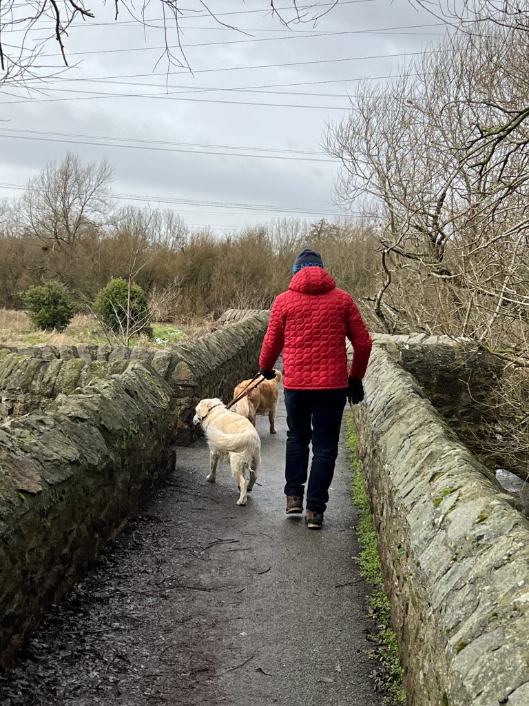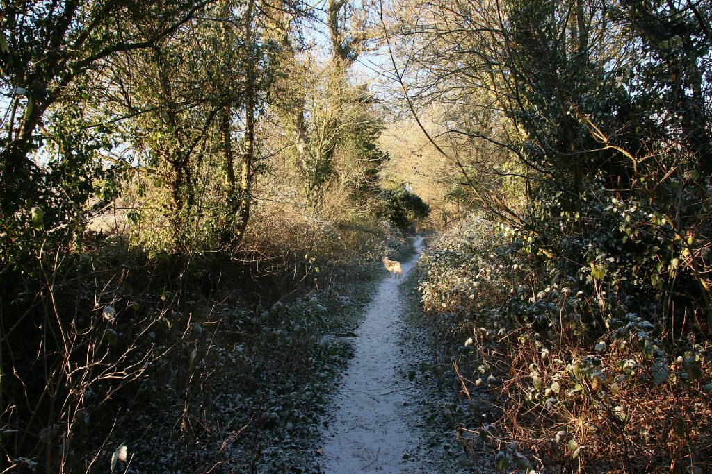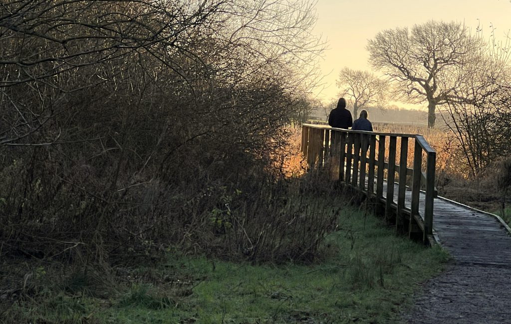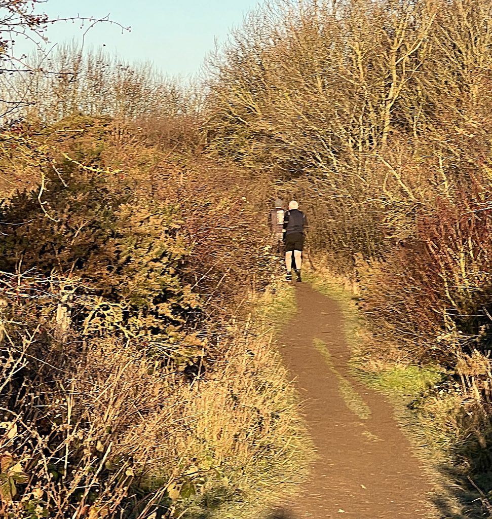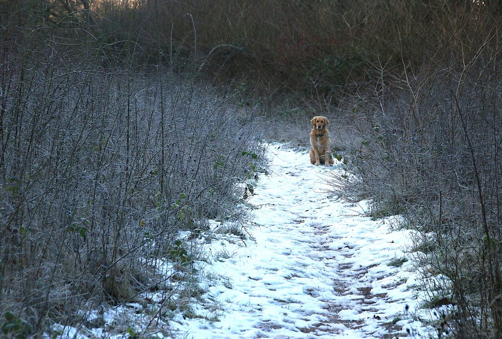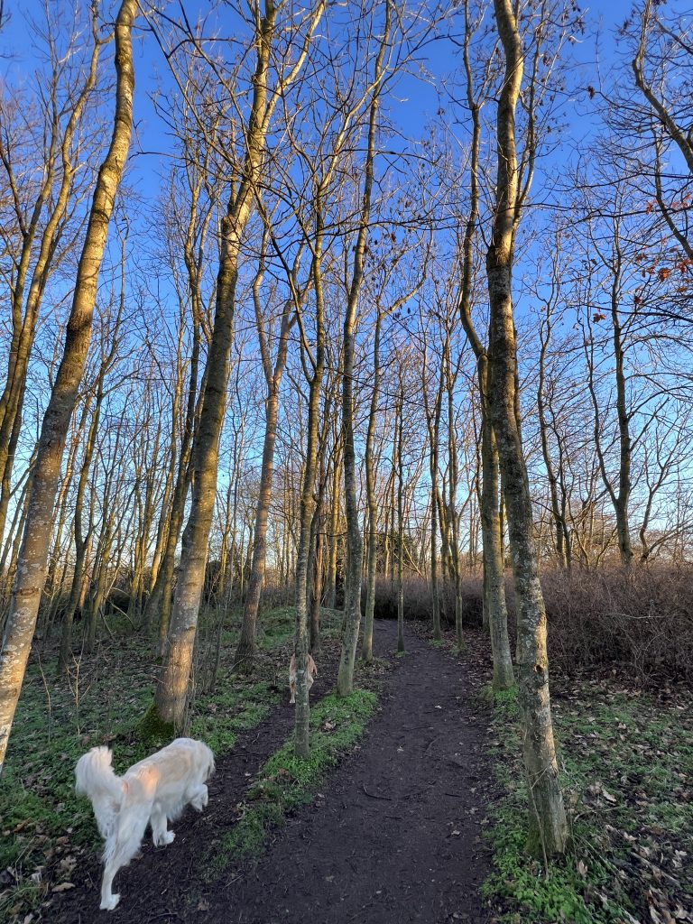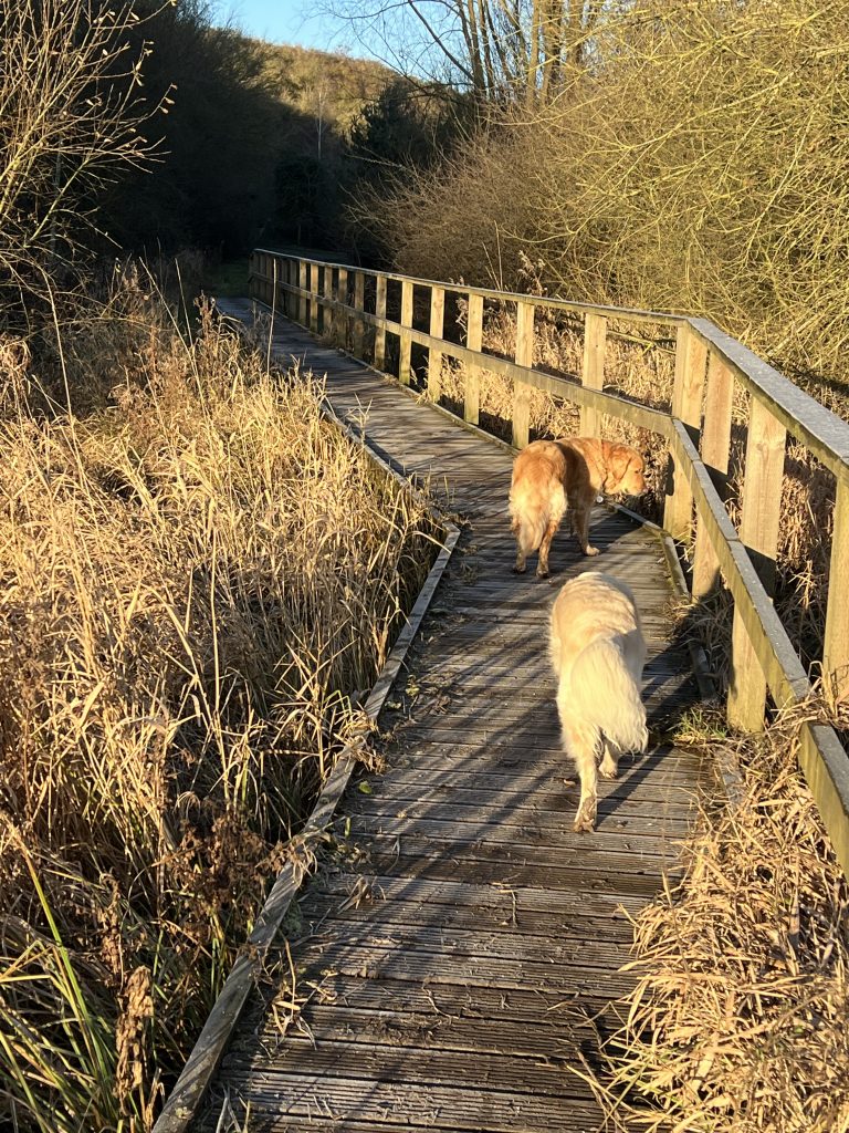 Passing the wildlife ponds, I cross an icy-slippery boardwalk and meet a mum and adult son. They are not accompanied by a dog but, like the runners, want to greet my two. Mum would like a dog, but her husband won’t have one. Too much fur, and too much of a tie. He has a point. By the time that we part and they head for the boardwalk, she is covered in white hairs from Sam, trying with limited success to dislodge most from her woollen gloves.