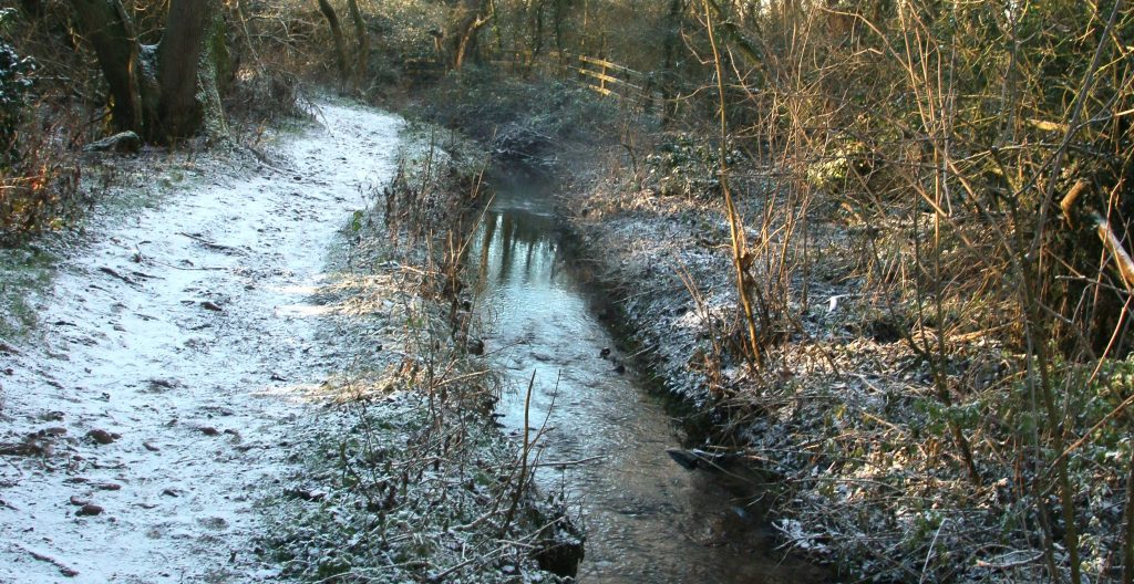 Before we emerge from the enclosed trackways back onto turf tracks beside arable fields we pass a small stream, usually an opportunity for the dogs to have a dip and swim, but not today. Far too cold for paddling.