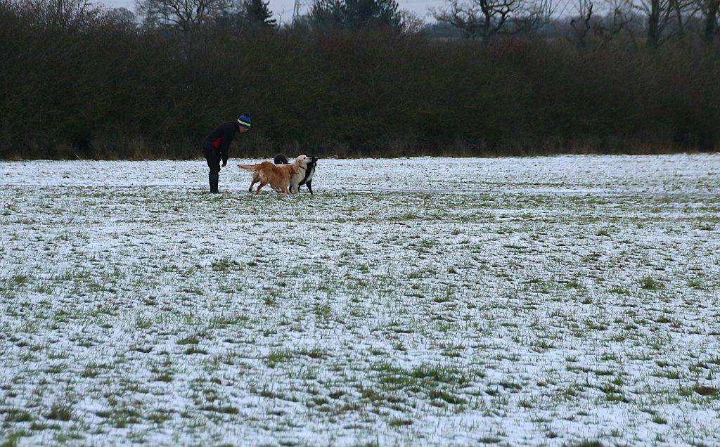 Heavy snow last night, large wet flakes that settled, but with roofs and gutters already dripping while snow fell. There is a covering of wet snow when we set out on our walk, but certainly not deep and crisp and even. The dogs love it though, running through the snow, slush and patches of mud as we make our way down to the sheep field for a quick circuit – we are out and about again later, and so a short early walk will suffice. We have the field to ourselves, and the dogs run through the lying snow, playing and exploring the scents of the riverbank.