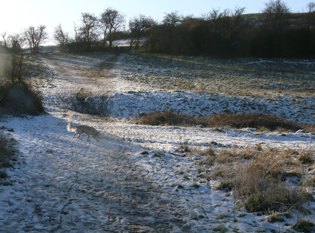 We cross the road to walk up the steep and rutted track up the side of the “New Hill”, this track usually muddy and so mostly avoided at this time of the year, but today frozen, as the path climbs between the wintery-bare shrubs and grasses on the side of the hill. At the top we meet a family, Mum, Dad and young daughter. Mum and Dad are keen to say hello to Sam and Ellie, the daughter less so, despite sharing her name with Ellie, and I hang on to the dogs collars to prevent an over enthusiastic greeting to Ellie the daughter, who is shorter than pooch-Ellie would be if she chose to jump up to give a hug.