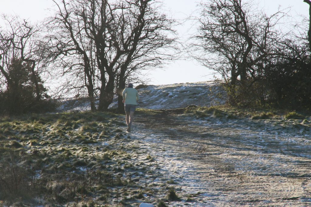 Emerging onto Croft Hill, the original “Old Hill” the path up is as icy as it has been for a few days, but today the overlying frozen snow gives grip as we climb. Two runners come up from behind and pass us, heading for the top. The dogs ignore them – they have long learned that runners do not stop to give them a fuss and a treat. The runners continue upwards and disappear through the line of bushes that grow below the Trig point at the top of the Hill.