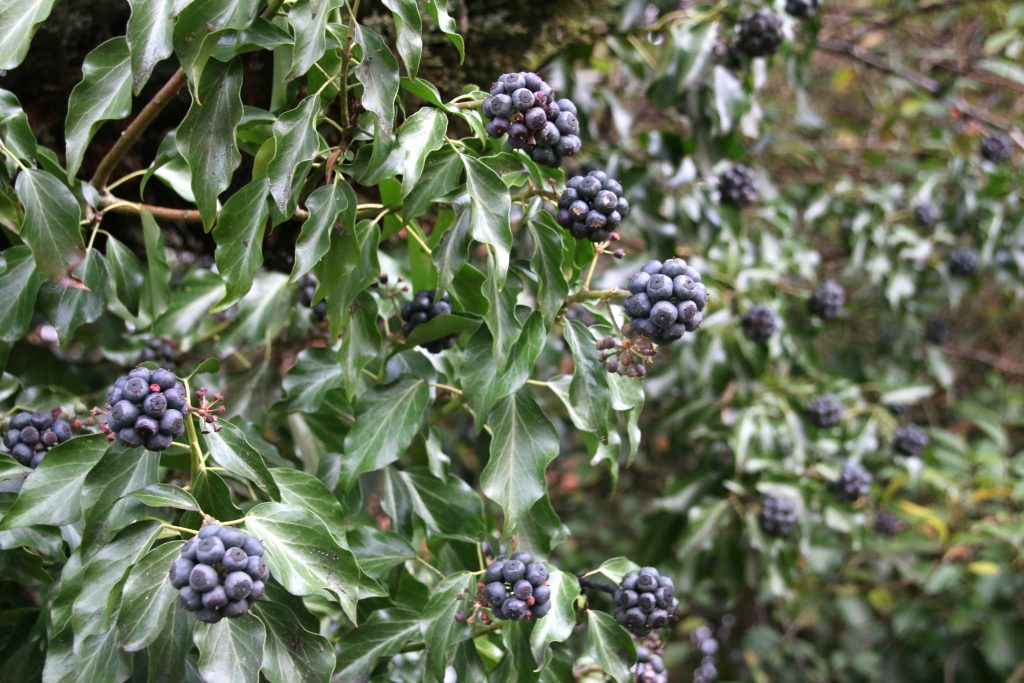 I decide to look out for any early signs of spring but only find those signs of nature that are part of the winter’s scene. At the top of our Lane ivy grows thickly over a hedge and out into the narrow verge, forcing walkers onto the road. The dense shiny dark green climber has produced masses of dark berries, welcome food for larger birds, such as blackbirds and thrushes, who cannot take advantage of hanging feeders in nearby gardens.