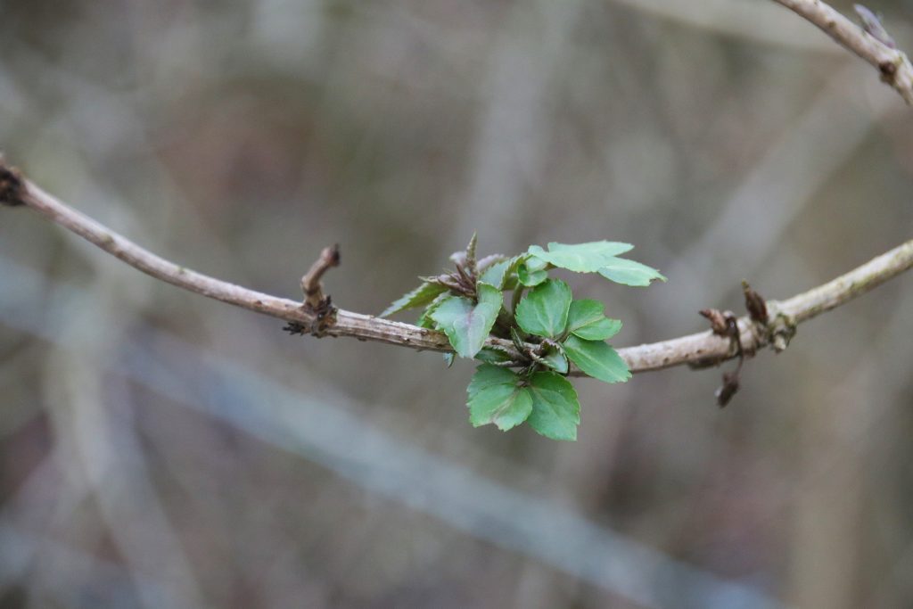 Elder leaves have already emerged, always one of the first shrubs to do so. At time of the year the shrub is barely noticeable but is summer it will produce the showy white umbrellas of blossom, which some collect to make elderberry wine or cordial.
