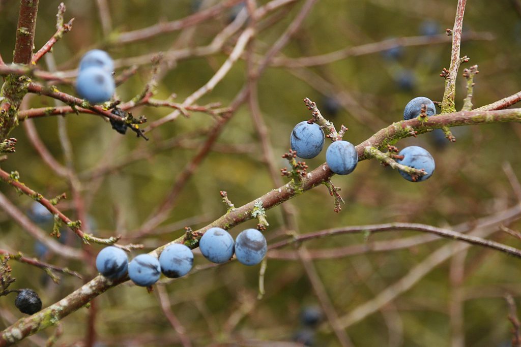 We had a particularly abundant crop of sloes this year, the berry of the Blackthorn shrub. Locals have picked what they need for sloe gin, or, in the case of one lady who I meet on Croft Hill, to make fruit tea, the sloes infused with other berries and herbs. Birds have had three months to feed on the sloes, but still the Blackthorne bushes bordering paths and fields bear a lot of the berries, now frosted and so technically at their best for Sloe Gin. I, like most people who make Sloe Gin, pick in October, before birds strip the bushes, at least in normal years, and then “frost” the berries in the freezer.