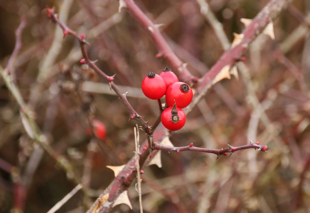 Rosehips, the berries of wild dog rose shrubs, are less abundant, but still quite common among the tangled hedges around the quarry. These berries, full of vitamins, can be used to make jelly, syrup or fruit tea, although I haven’t tried any of these recipes.