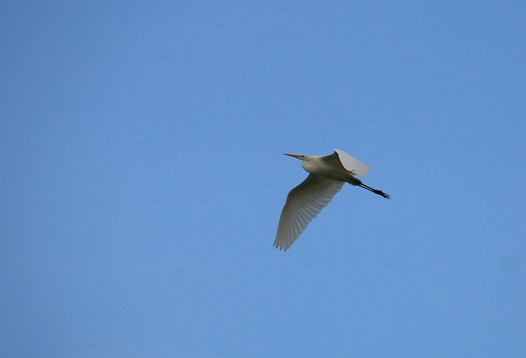 For various reasons it’s going to be short walk today, just a circuit of the Sheep Field. As we walk down the field track behind our home a Great White Egret takes off from a riverside rough land area in front of us. For several years this area was cultivated, but thanks to regular flooding the landowner has given up trying to grow crops, and the area has been allowed to “rewild”. At present the area is flooded, with marshy areas around the perimeter, and we often see the egret and a local heron standing in the water. I expect the egret to circle and either fly away from us over the Sheep Field, or settle back onto the marsh, but instead it flies over us before turning and landing further along the river.
