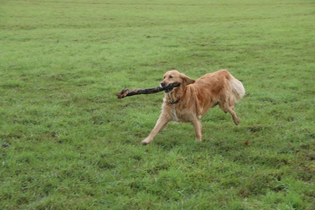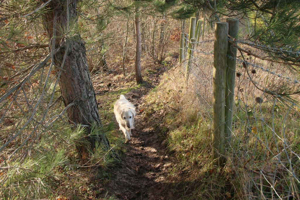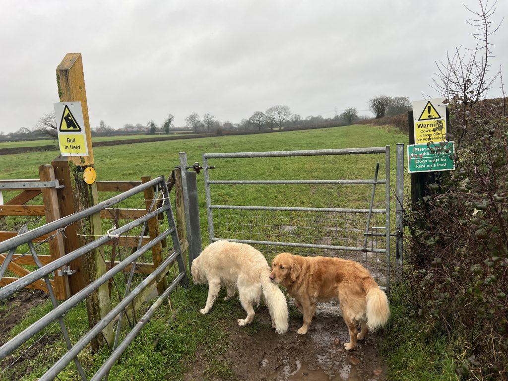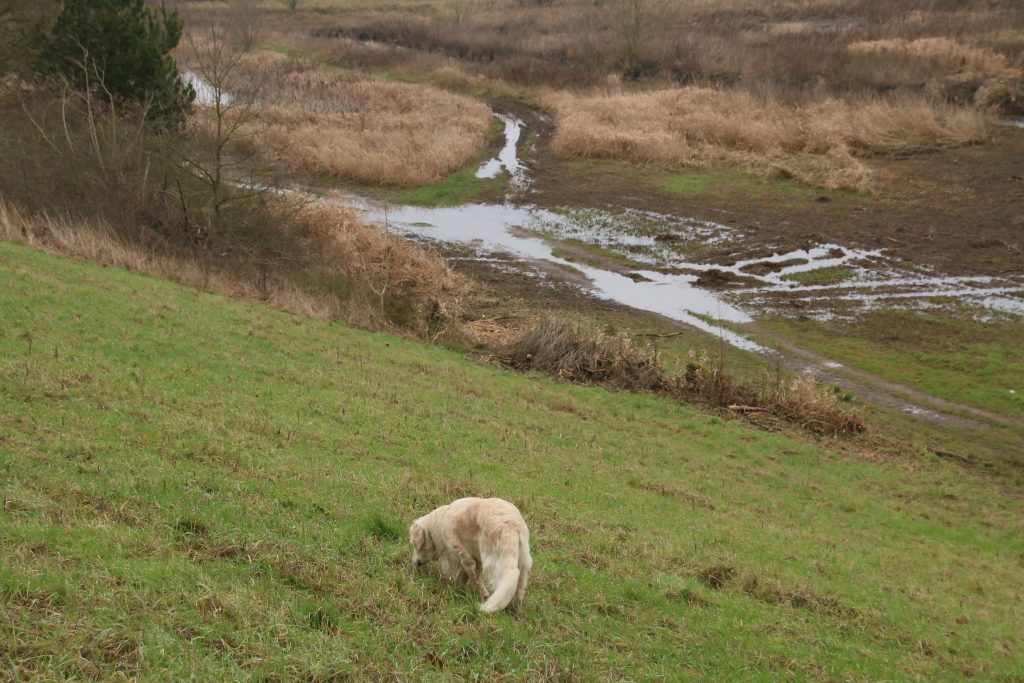 Ahead of us we see a dog-walker approach in the distance, and as we get closer my two dogs recognise the dog as a fellow Golden Retriever. The three dogs crouch on the ground, tails wagging, before they rush towards each other, running together in circles – Goldies always seem to recognise each other, and are enthusiastic in their greetings. Unusually the owner was not so enthusiastic, and after a brief nod and smile continued on, calling his dog, without the usual chat between owners of the same breed. A couple of minutes later we meet Collie Bryn and his owner, regulars on our routes, and we stop to chat, the usual topic between dog walkers at this time of the year – weather and mud.
