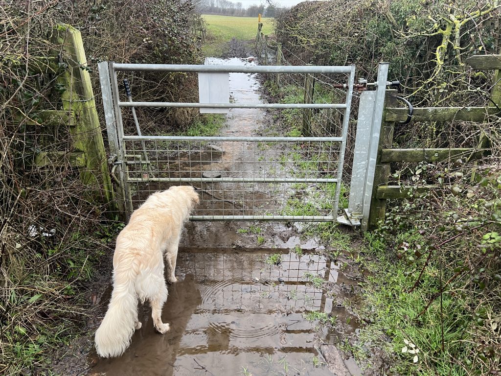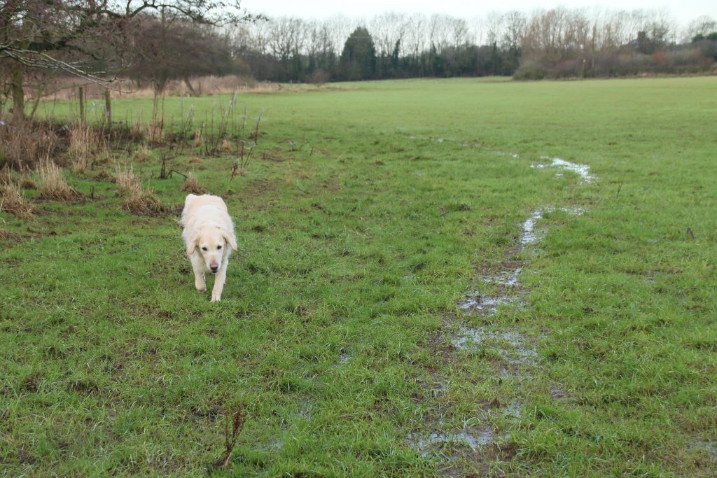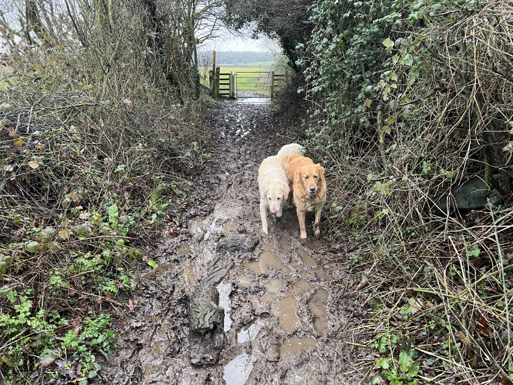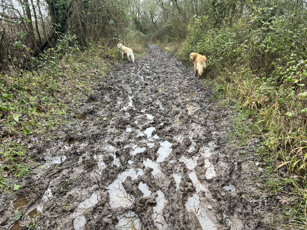 We finally reach a road, and cross to the end of a bridleway that will lead to the fields behind our home. Whole stretches are ankle deep in mud. The dogs sensible hug the narrow edges beneath the hedgerows, but this isn’t an option for me, and wading through the porridge-like consistency is hard work, with the potential to end up on my back for an unplanned mud bath. Along one of these semi-liquid paths we meet a couple with a large Rhodesian Ridgeback on a lead. I manage to get my two on a lead, as they explain that their dog gets very excited when meeting others. We agree that this area is not the best for dogs to play in, or even “meet and greet” on lead, with the potential for dogs to pull owners onto their faces in the mud.
