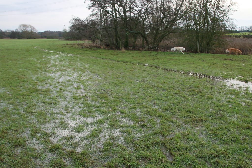 We cross the river bridge into the Sheep Field. Thanks to last week’s snowmelt followed by a couple of days of heavy rain the ground squelches beneath my wellies, and the dogs run through pools of water. The track through the grass left by the sheep when last in residence is a rivulet of standing water.