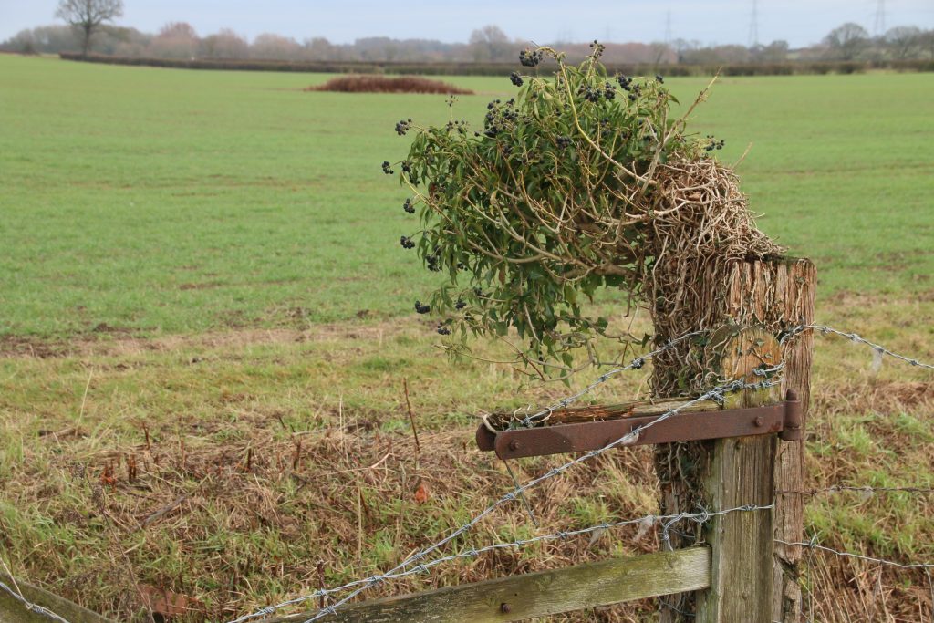 Following the edge of the field, a gate post sprouts a bunch of ivy, what is left after the overgrown gate and fences were cleared earlier in the year to allow access into the field by sheep, driven from the farm across the fields. Two days ago, on a frosty morning, I looked over the gate into the field beyond, watching half a dozen hares chasing each other around the field. Today I just see one solitary hare grazing, before splash back across the field to cross back over the river bridge.