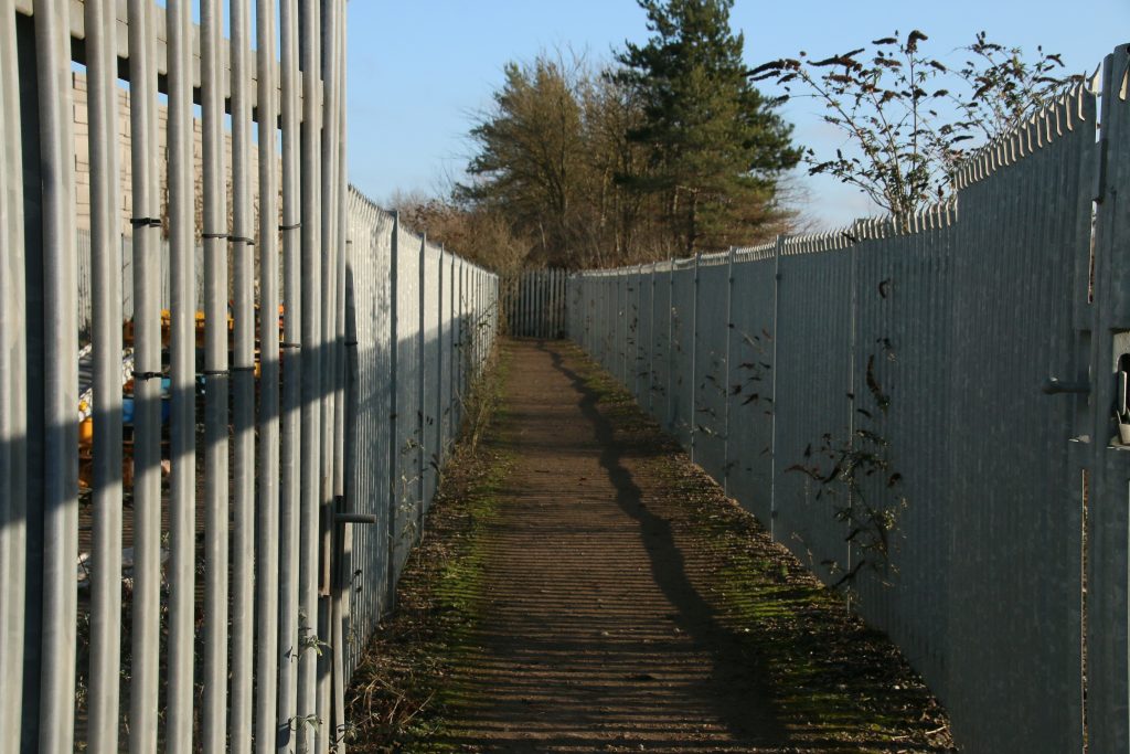 The next few hundred metres is not pretty, the path sandwiched between the Leicester-Birmingham railway and quarry buildings, the route lined with steel fencing. Locals are still grateful for this route, created by the quarry a few years ago. Until the path was constructed there was no way of circuiting the quarry from the local village, and despite its urban appearance, the route is popular with local dog walkers, a convenient 3 mile circular walk from the village, with the option of climbing Croft Hill.
