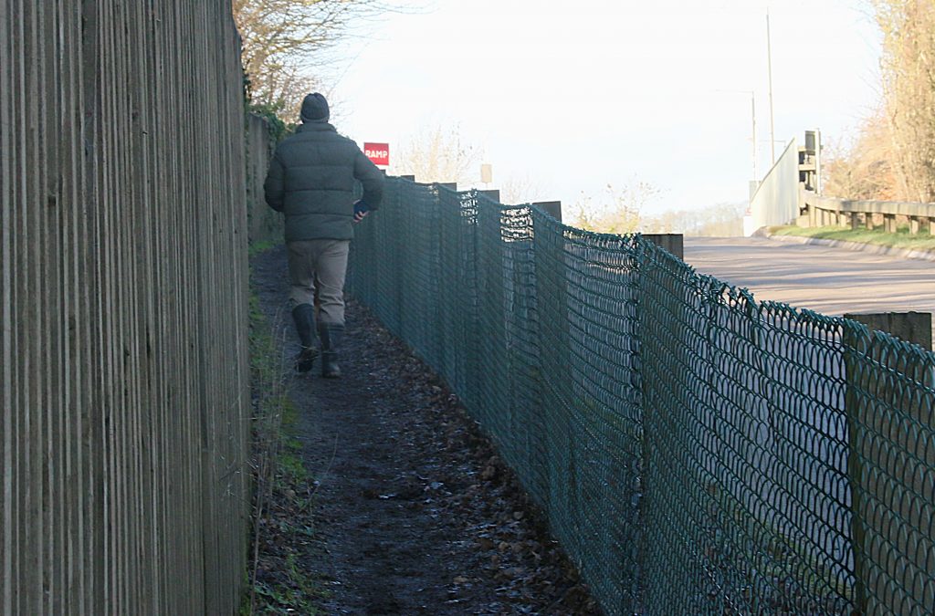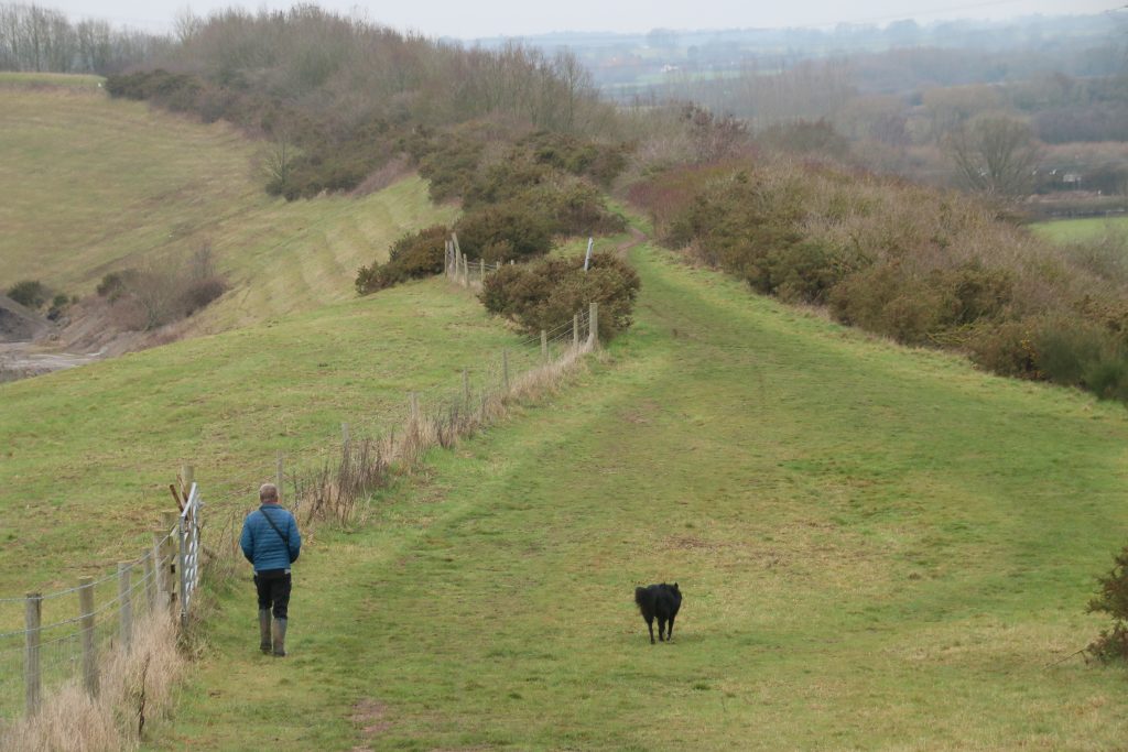The path eventually leaves the railway, twisting up a short ramp to join the quarry access road, a fence separating walkers from the quarry lorries that rumble past on weekdays. This is only a short stretch before we reach steps down to the village recreation ground, but it is along the short narrow path beside the quarry road that we meet our first dog walkers, three groups, one after another, and we have to pass close, constrained by the fence – luckily all dogs are friendly, and merely want to “meet and greet”.