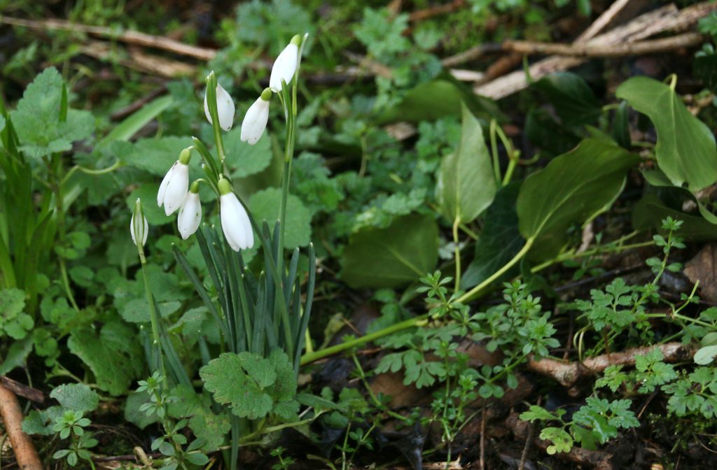 Crossing the recreation ground we eventually get the old village, originally a cluster of terraced quarry-workers houses huddled around what was then the quarry entrance. Now this road is a quiet cul-de-sac, the terraced houses supplemented by larger houses of various ages. At the end of the road we pass the pub, my local, and then the village church, where we turn to follow the track along the lane back home. At last, I see what has been reported elsewhere for a week or so – wild snowdrops, the first true sign that spring is on the horizon.