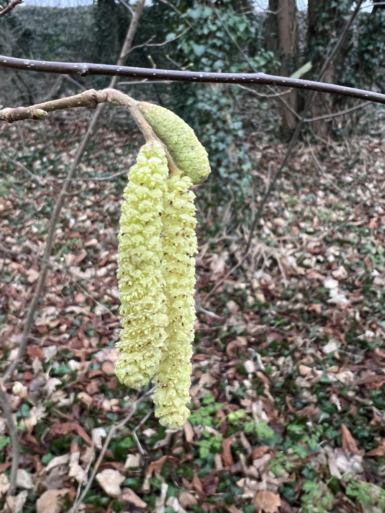 Hazel catkins dangle from large shrubs that border the lower path down from the Hill to the bottom gate onto the Lane. Hazel bears male and female catkins on the same plant, those fluttering in the wind, resembling tiny wriggling lambs’ tails being the female. No insects at this time of the year – the catkins rely on wind to distribute pollen.