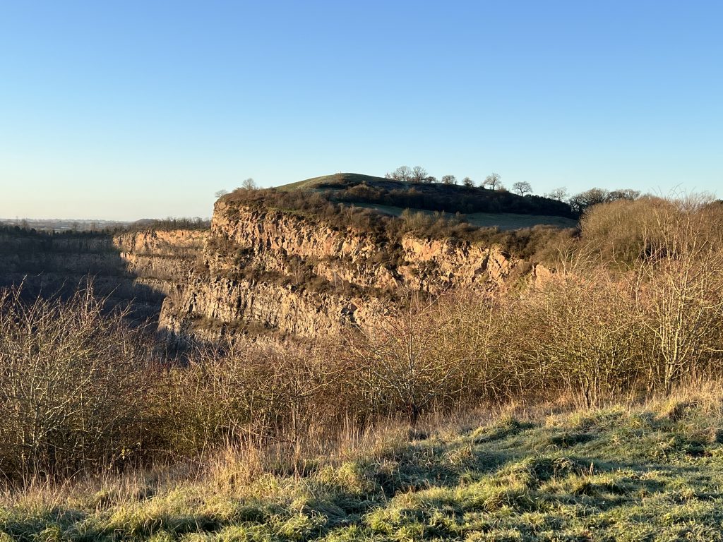 A cracking morning dog walk, a cold wind but a clear blue sky and bright winter sunshine, the ground frosty in places. The cold easterly wind of recent days has dried the muddy paths, and this, together with a touch of frost, means that the ground is firm, and there is a chance that I might get the dogs home clean. We walk through the spinney at the bottom of Croft Hill, and follow the steep path to the quarry edge, appreciating that we can walk over the rutted areas that at this time of the y/ear can be a bit of a quagmire, thanks to the popularity of this route with walkers and mountain bikes.