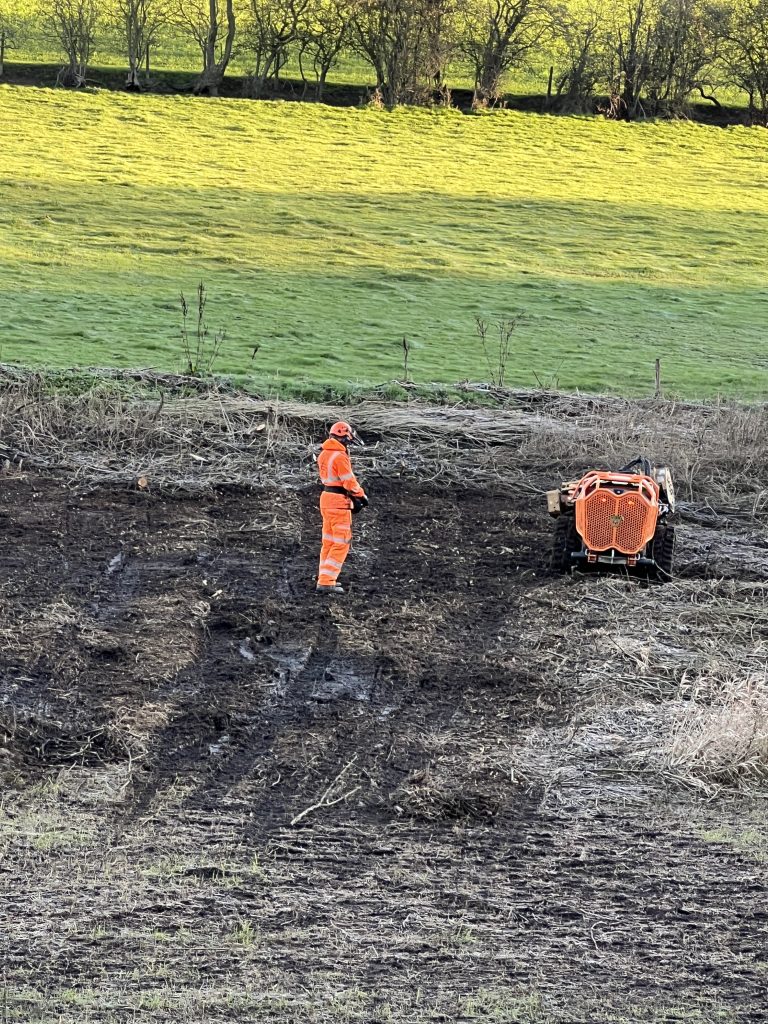 We emerge from the trees just above the river and wildlife ponds where a contractor is clearing levelling an area, previously thick with reeds and grasses – probably management of the environment rather than anything more destructive. We will see over the next few months. He uses an intriguing machine, a small remote controlled tracked vehicles with a digger/bucket on the front. In the summer I have seen the same item of plant being used to cut grass on steep hillsides, on that occasion with a mower on the front.