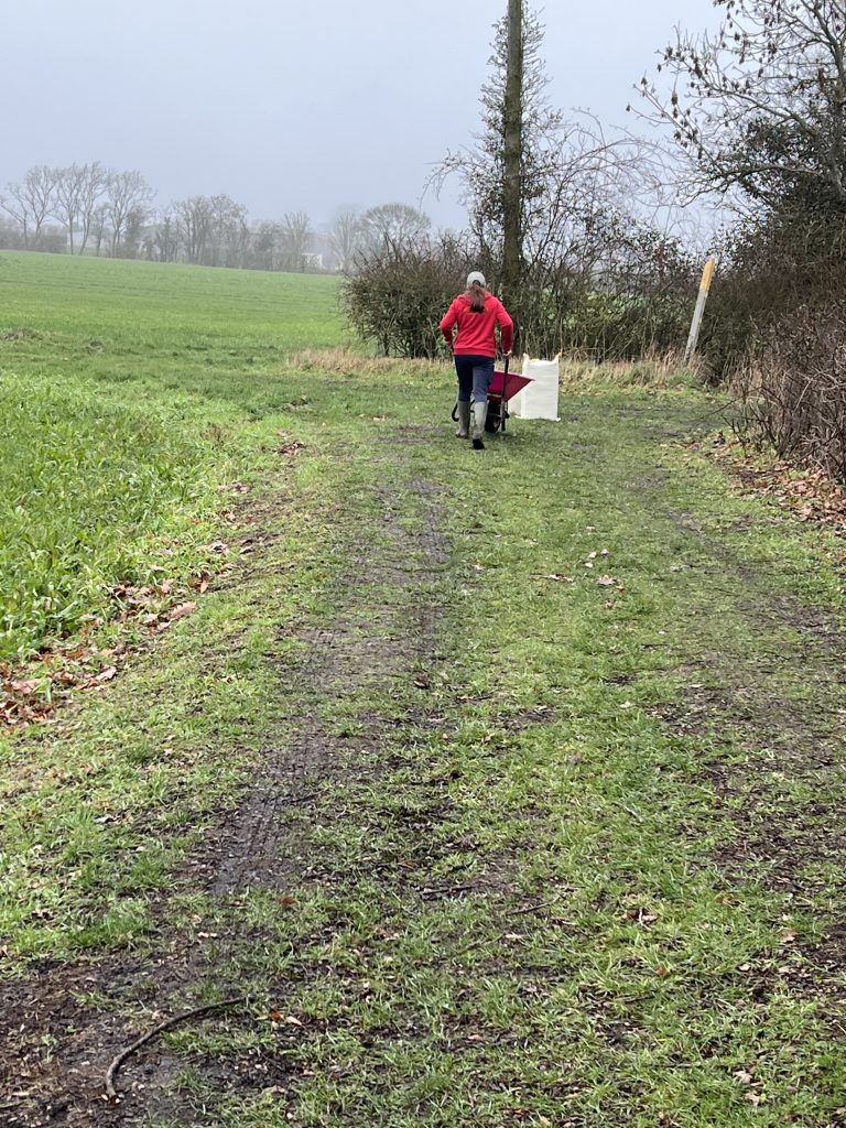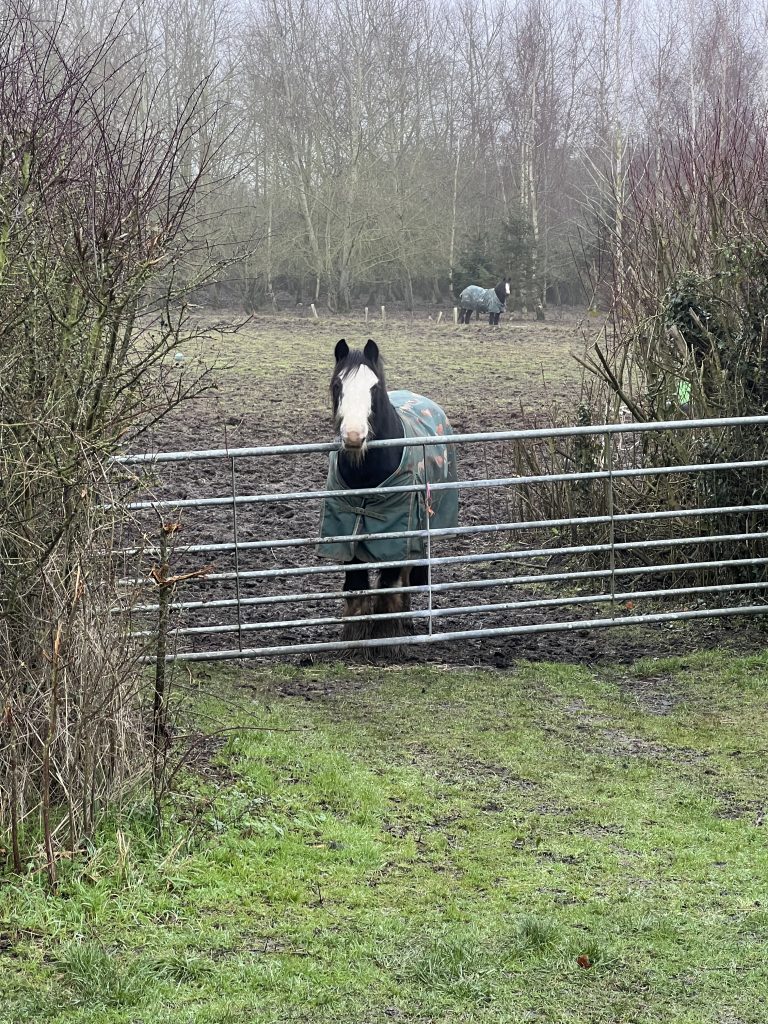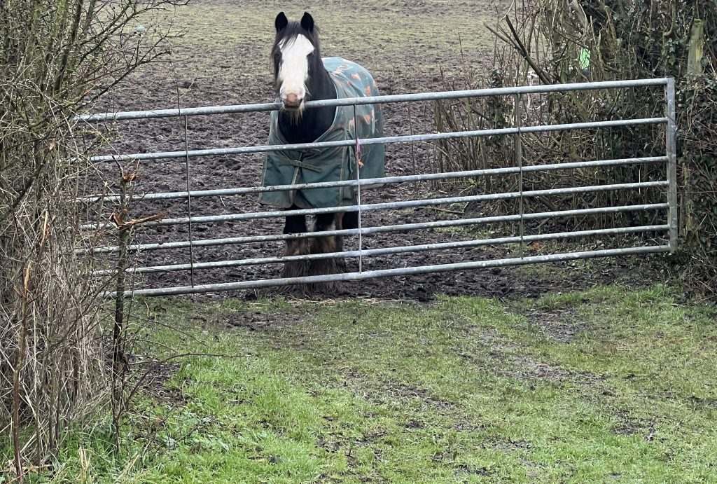 We cross the road to follow a private lane leading to a bridleway. A man in a high-viz coat is bending down by his car at the top of the lane, and I wonder if all is is well, but he explains that he always stops here to feed a robin that sometimes lands on his hand – the robin flew into the hedge as we approached. He usually drives down the lane and along the bridleway in his car, not a 4×4, to take food, and today containers of water, to a field where his daughter keeps horses. I’ve not met him before, but I knew from other dog walkers that this was a daily event. Today he decided that the bridleway is too slippery for his car, and he has dropped off the horse supplies at the bottom of the lane. I meet his owner coming along the bridleway pushing a wheelbarrow to collect the supplies. We stop to chat – she rents three fields, using just one at a time so that she can move the horses around to prevent the ground from being churned up. The current field is muddy by the gate, but mud free beneath trees at the back – they will stay there for the time being