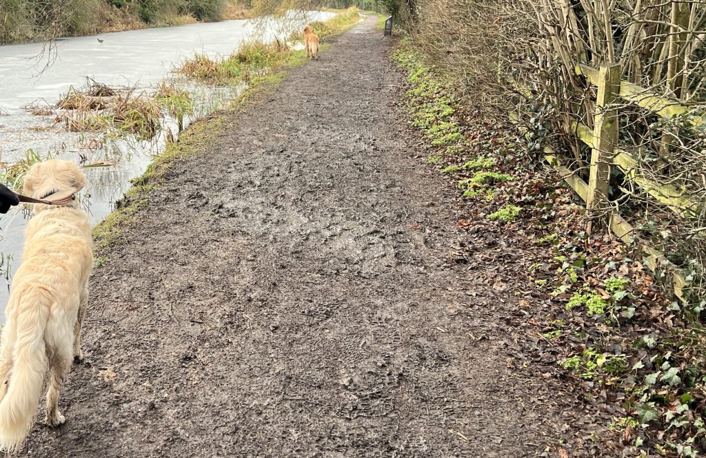 Our route continues along the wet lower path, puddles and mud frozen but not enough to support dogs’ paws. Their legs will need hosing when we get home.