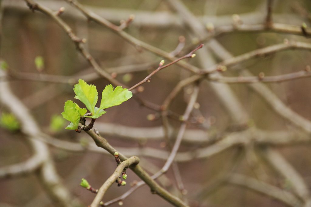 Another small but promising sign that Spring is on the horizon – a tiny first leaf on a Hawthorn bush at the bottom of Croft Hill. Just the one leaf, hardly the “sheen of green” that will appear on hawthorn hedges in a few weeks, as each branch is covered in buds and newly emerged leaves, a coating of powdery green over the underlying bark of the branches beneath.