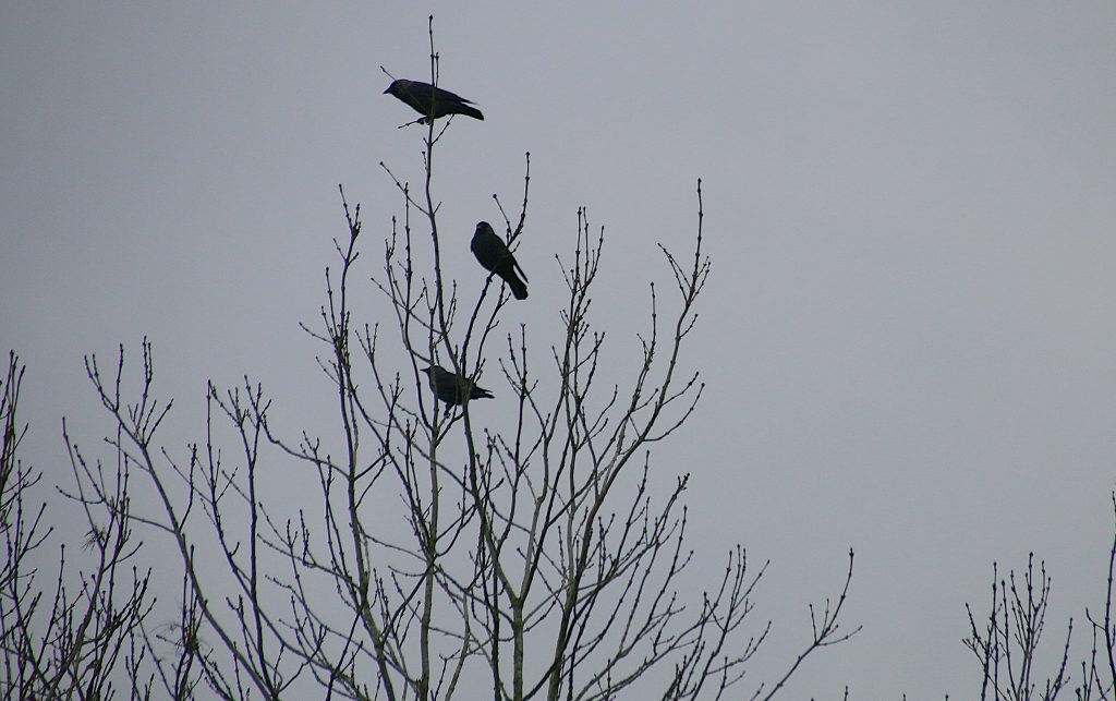 A large flock of crows, a “Murder” of carrion crows, sits in the trees around the quarry edge, all but a few casually flapping away as we approach, to circle lazily around us and settle back into the bare branches behind us. Although there a lot of crows around the quarry, it is unusual to see so many gathered together in the highest branches of just two or three high trees. We usually see them circling below in the quarry, or higher in the sky, mobbing birds of prey.