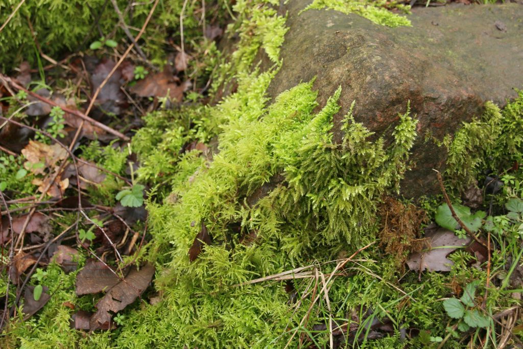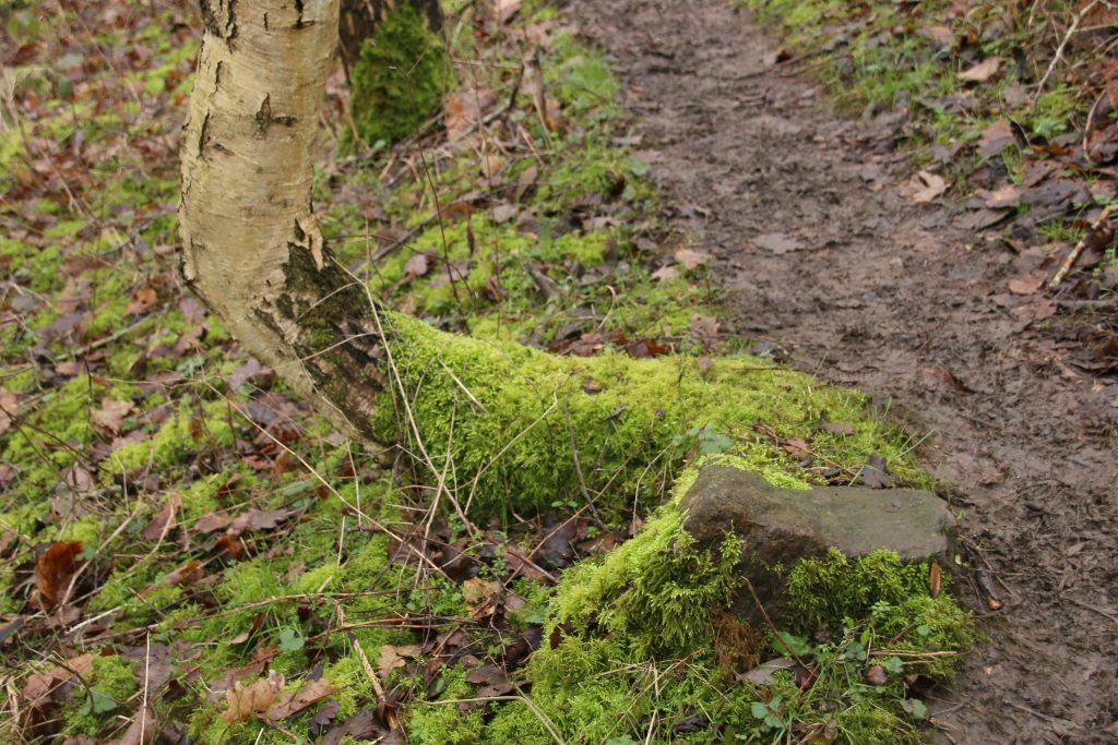 We descend through the woods, mostly birches, with views of the river and flooded fields visible below through the bare trunks and branches. Between the silvery bark of the trees the woodland floor dominated by tired looking brambles, and much more verdant green moss, thriving on lower tree trunks and path-side rocks. This slope faces north, the ground damp, allowing cushions of mosses to thrive. During the drought and heat of last summer, the moss dried to a green-tinged brown, but moss is resilient, and now the soft green growth almost fluoresces in the shade of the woodland.