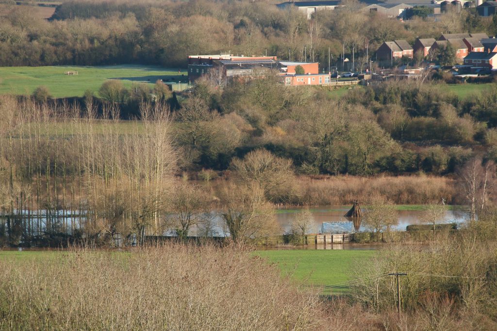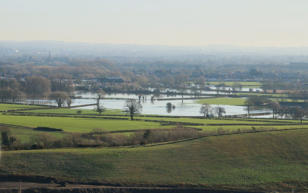 It is just as well that Sam and Ellie are on leads, since as soon as the small dog spies my two it begins to bark loudly and aggressively. I’m sure that my two would have stayed clear, even if off lead. I greet the owner, before stopping briefly to admire the view myself – the landscape around us is wet, very wet, with flooded fields in all directions.