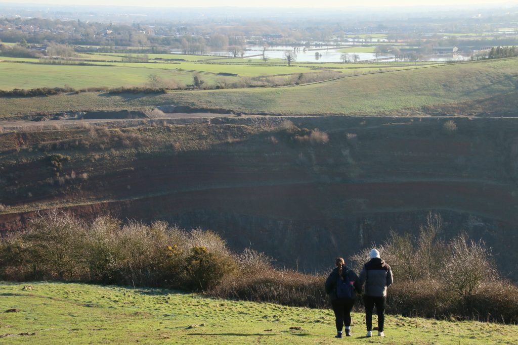 Bright sunshine and blue sky, and so it is surprising that other walkers are few and far between. We walk onto the bottom of Croft Hill, the breeze rattling the branches of young birch trees that line the path. Up the muddy incline onto the quarry edge path, gradually ascending and enjoying the clear views. A lone walker emerges from the grassy slope above the lower path. I suspect that she has decided to join the higher path to avoid the worst of the deep mud at the bottom of the slope. My “Good Morning” as I keep the dogs close is greeted with a wave.