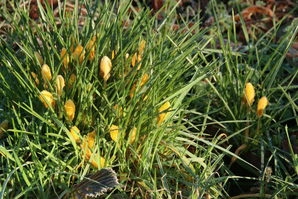 I carefully descend the Hill, staying on rough grass as the dogs confidently run and play around me. With Four-Paw-Drive, they are not going to slide uncontrollably down the frozen ground. The track from the Hill down to the road is thawing in the sun, and the dogs begin to get muddy, as they have been after every walk for weeks. In an attempt at mud-minimisation I choose not to cross the road to walk on the Glebe – the path to the entrance gate is ankle-deep in liquid mud. Instead we walk down to the village along the tree-lined top path, returning along the lower path, where we a greeted by a cheerful group of crocuses, one of several growing between the two paths.